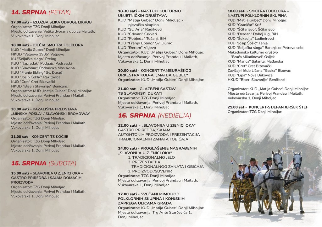 18.00 sati – DJEČJA SMOTRA FOLKLORA KUD “Matija Gubec” Donji Miholjac HKUD “Valpovo 1905” Valpovo KU “Seljačka sloga” Prelog KUU “Napredak” Podgajci Podravski KUD “Slavonac” Podravska Moslavina KUU “Franjo Ebling” Sv. Durađ KUD “Josip Čoklić” Rakitovica KUD “Cret” Cret Bizovački HKUD “Biseri Slavonije” Beničanci Organizator: KUD „Matija Gubcc” Donji Miholjac Mjesto održavanja: Perivoj Prandau i Mailath, Vukovarska 1, Donji Miholjac