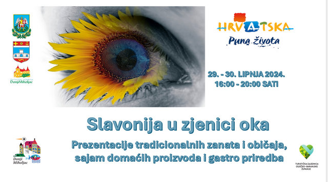Projekt „Slavonija u zjenici oka“ programska je aktivnost usmjerena prema očuvanju, zaštiti i promidžbi kulturne baštine. Projekt ima za cilj živopisnim prezentacijama prenijeti običaj/tradiciju kulturu življenja uz gastro doživljaj prošlih vremena. I ove godine u okviru održavanja manifestacije 50. smotre folklora „Miholjačko sijelo“ održati će se sajam domaćih proizvoda, tradicionalne prezentacije zanata i običaja: